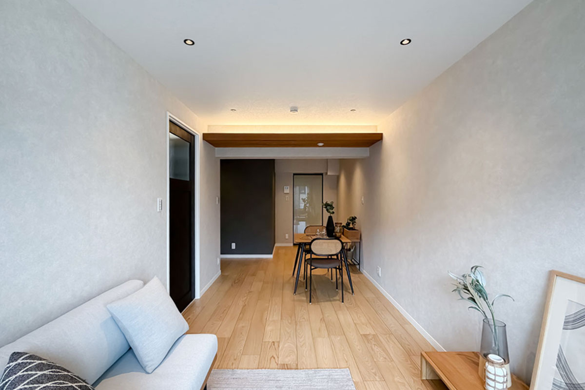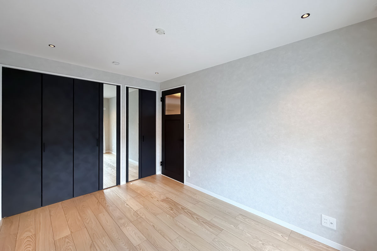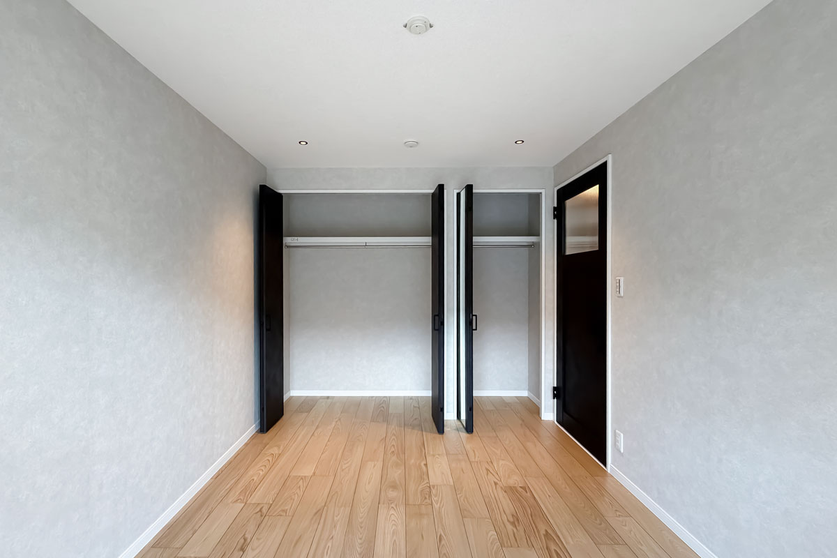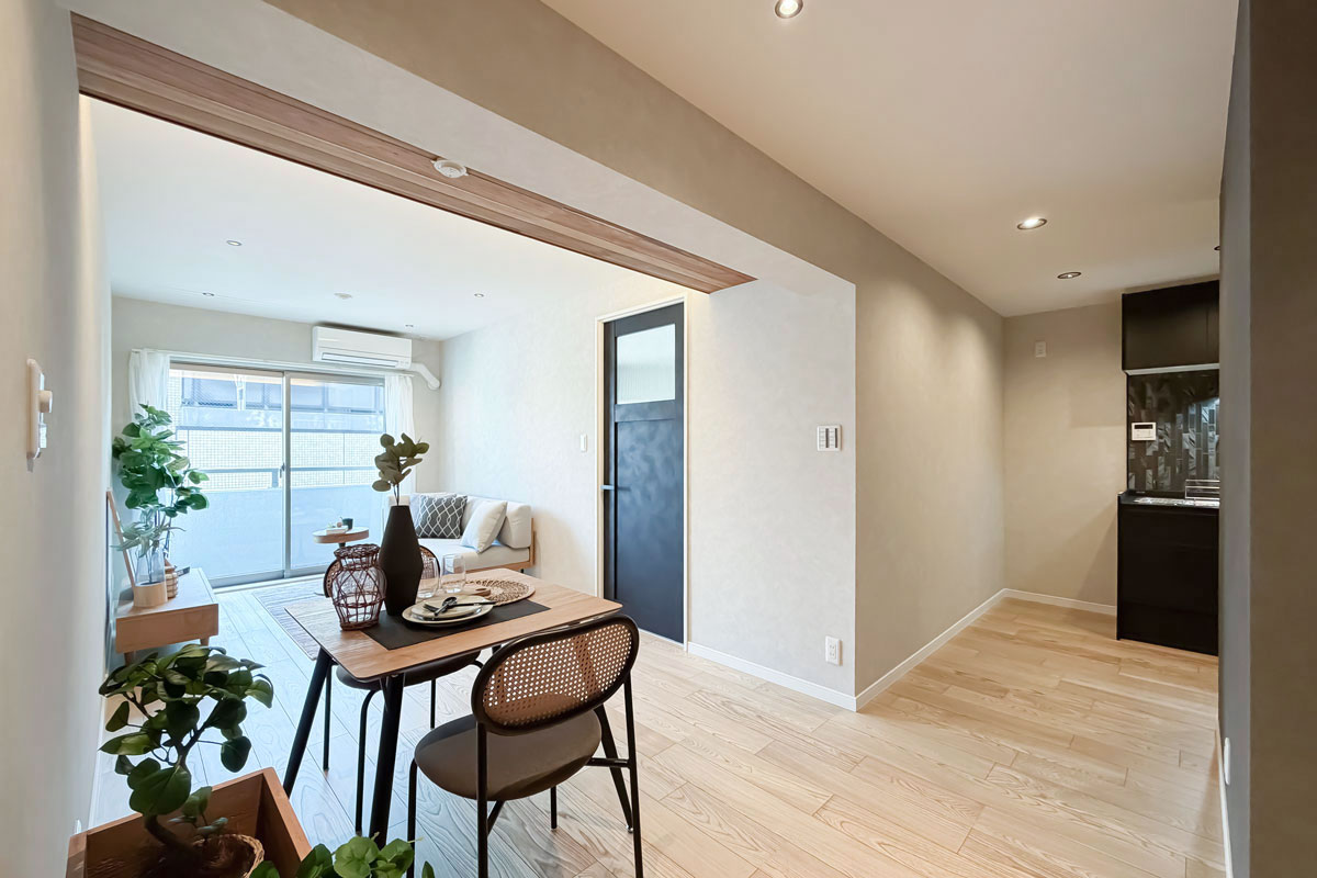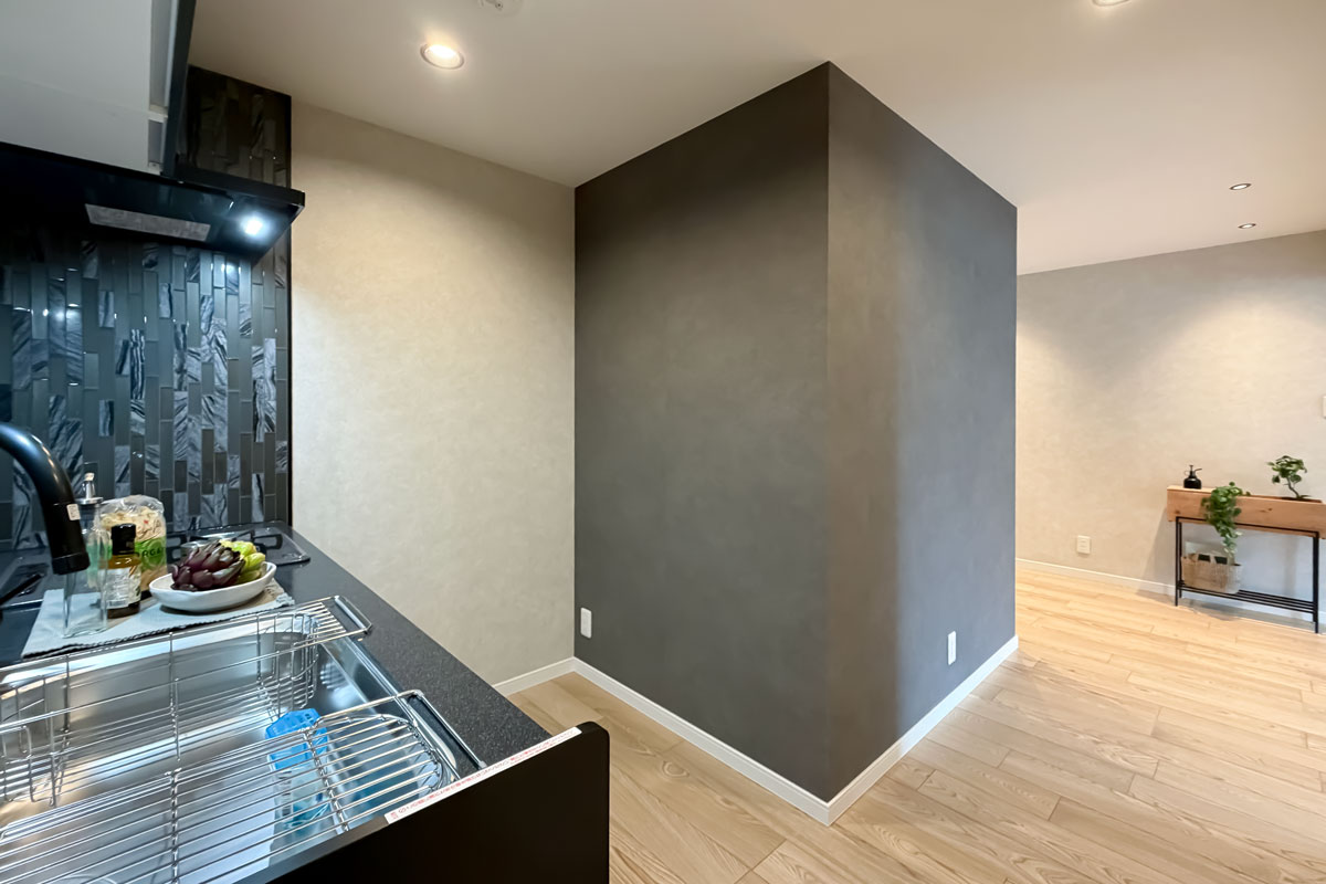 室内はリノベーションが施され、黒と木目がアクセントになった内装がとてもおしゃれ。クロスやフローリングは張替済み、水回りも交換されていますので、室内にいるとレトロさはまったく感じません。洋室にある備え付けの収納は大容量、キッチンスペースもゆったりしていました。