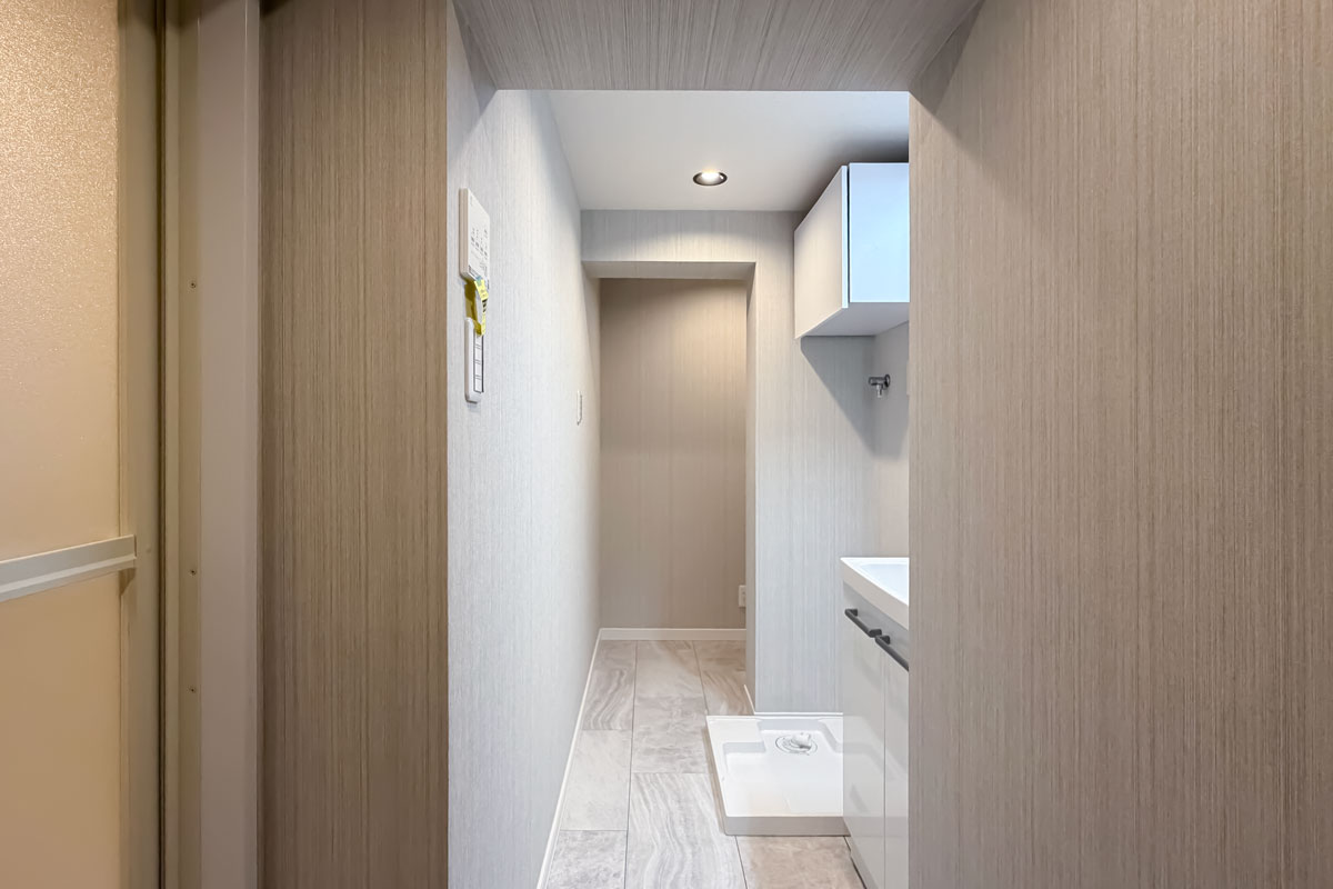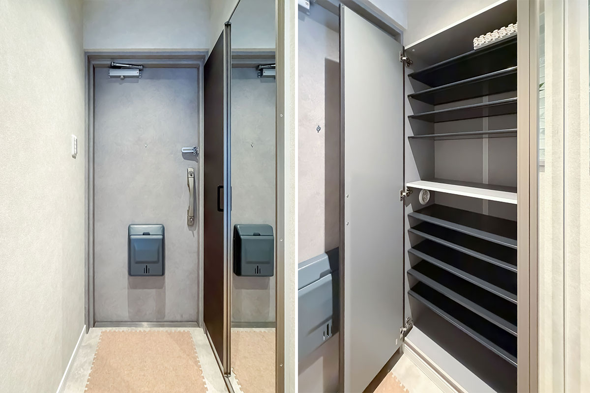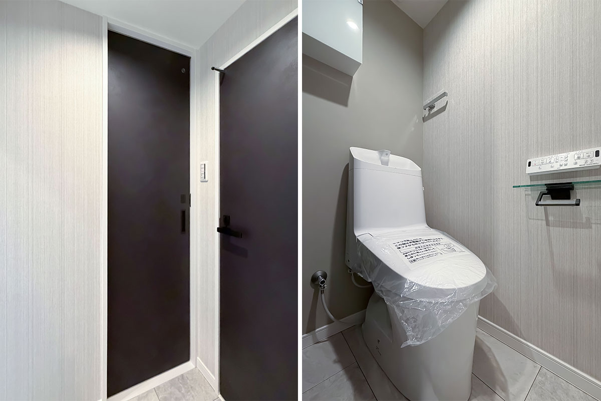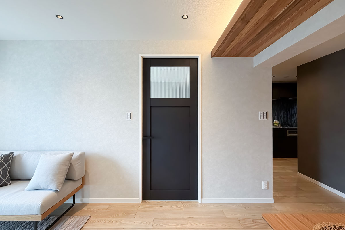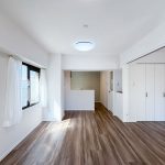 室内はリノベーションが施され、黒と木目がアクセントになった内装がとてもおしゃれ。クロスやフローリングは張替済み、水回りも交換されていますので、室内にいるとレトロさはまったく感じません。洋室にある備え付けの収納は大容量、キッチンスペースもゆったりしていました。