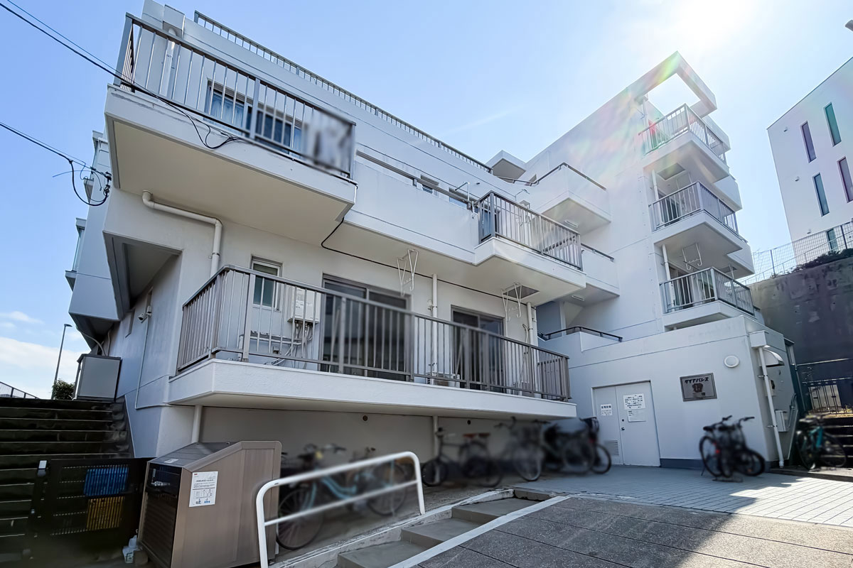 昭和54年築のヴィンテージ、エレベーターとオートロックはなしのマンションです。物件の目の前は短い上り坂になっていますが、負担はあまり感じませんでした。