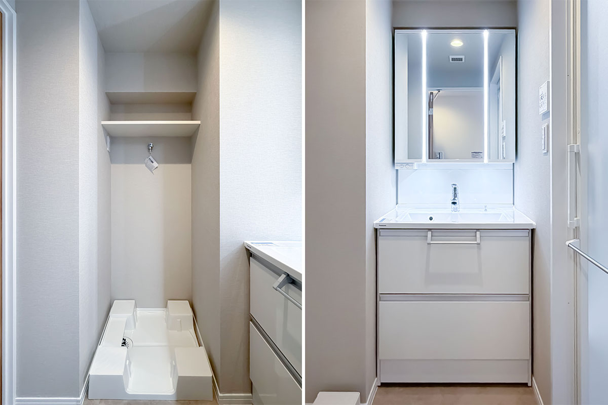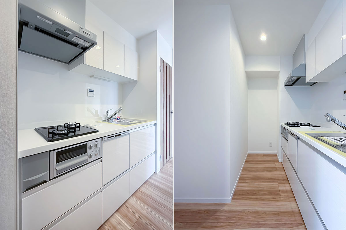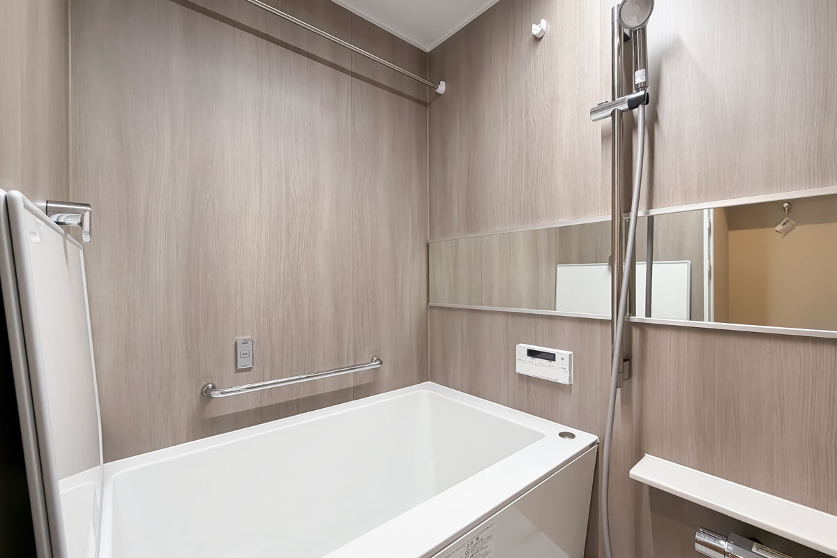 設備は、浄水器・食洗機付きのシステムキッチン、追焚・換気暖房乾燥機がついたユニットバスなど、生活を便利にしてくれる機能が整っていました。LDKにはエアコンが一基すでに設置されていますので、新生活をスムーズに開始できます。