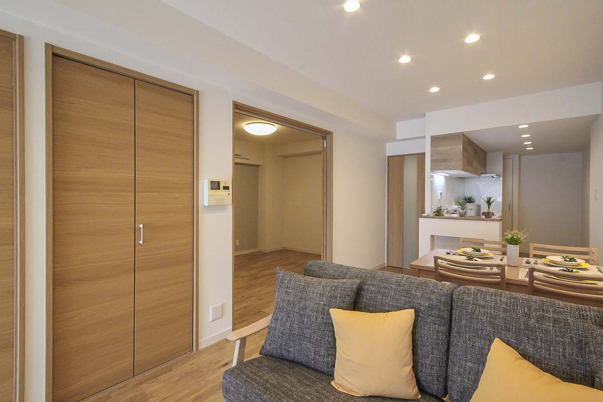 リビングとバルコニー側の洋室をつなぐ扉は、光を通すためLDKも明るく、上手なリノベーションだと思いました。