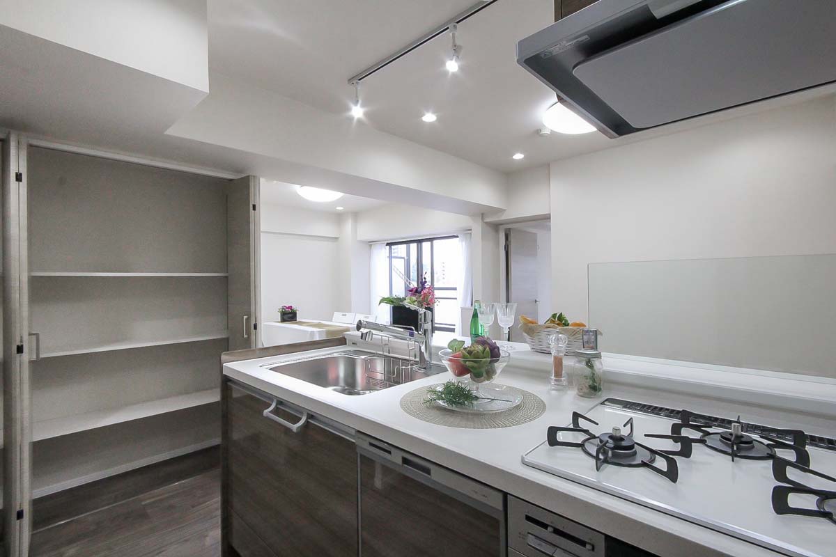 玄関を入って右手に水周りがまとまり、左手に大型のウォークインクローゼット付きの主寝室、その先に約13帖のLDKと6.3帖の洋室、洋室は2部屋とも6帖以上で形もよく、主寝室は将来的にリノベーションで2部屋に分けることも出来ますので、4人家族の方にもおススメのお部屋です。