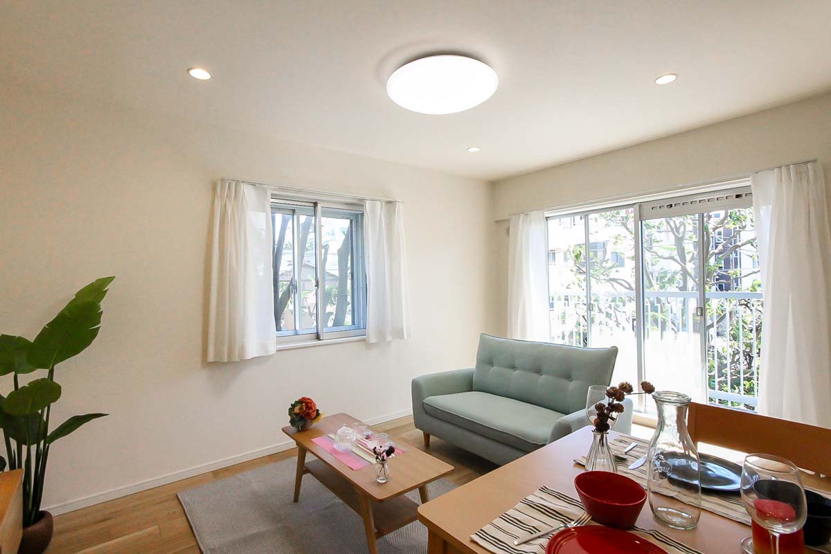 お部屋は62.91㎡の3LDKタイプ、日当たりの良い南東角部屋、室内はリノベーションがされ家具付きでの販売となりますので、これから家財をを揃えて直ぐに生活を開始したいという方にピッタリ。