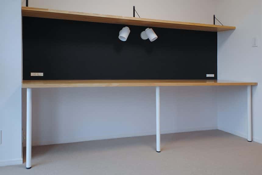 子ども部屋の壁は、家族みんなでペンキを塗り、子供部屋にはポップなピンク色と水色が入りました。勉強机は並んで勉強できるように、子どもたちに合わせて新たに手造り。時間割を貼ったり宿題を書いたりできるよう、前面には黒板塗料とマグネットペイントでオリジナルの黒板を作りました。
