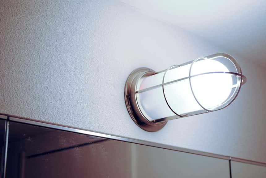 洗面台の照明は、船舶照明に。漁船や客船に使われている、船舶照明は、ロングライフデザイン。空間のアクセントして一役買っております。