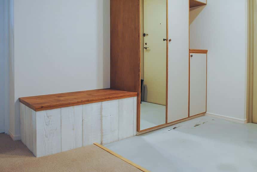 お友達やその子供たちがご自宅によくいらっしゃるということで、玄関は広めにし、土間コンクリート打ちに。荷物を置いたり、靴を履いたりできるように、ベンチもオリジナルで造作しました。