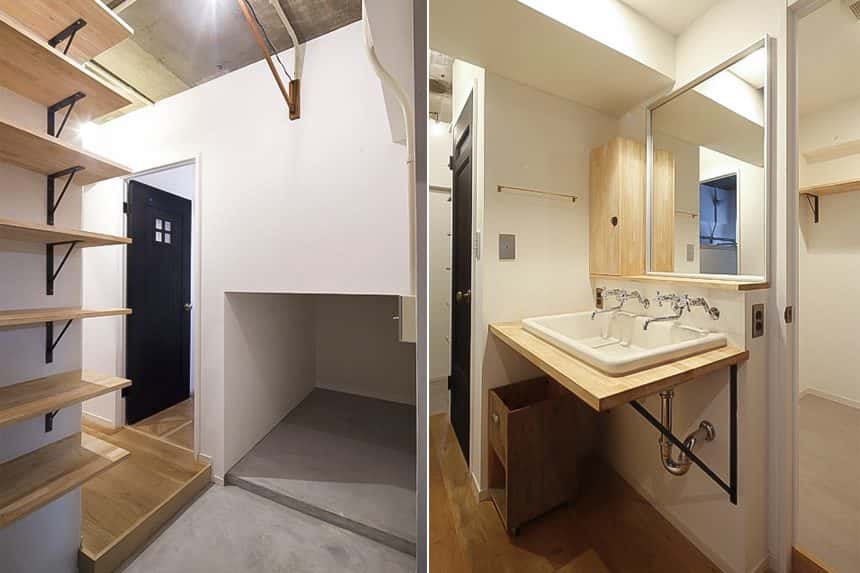 玄関から隣接する洋室に、胸の高さ程のロフトを作り、下部は玄関とつなげ土間コンクリートを打ち、屋外グッズ用のスペースに。そのまま自転車を収納できる広さです。