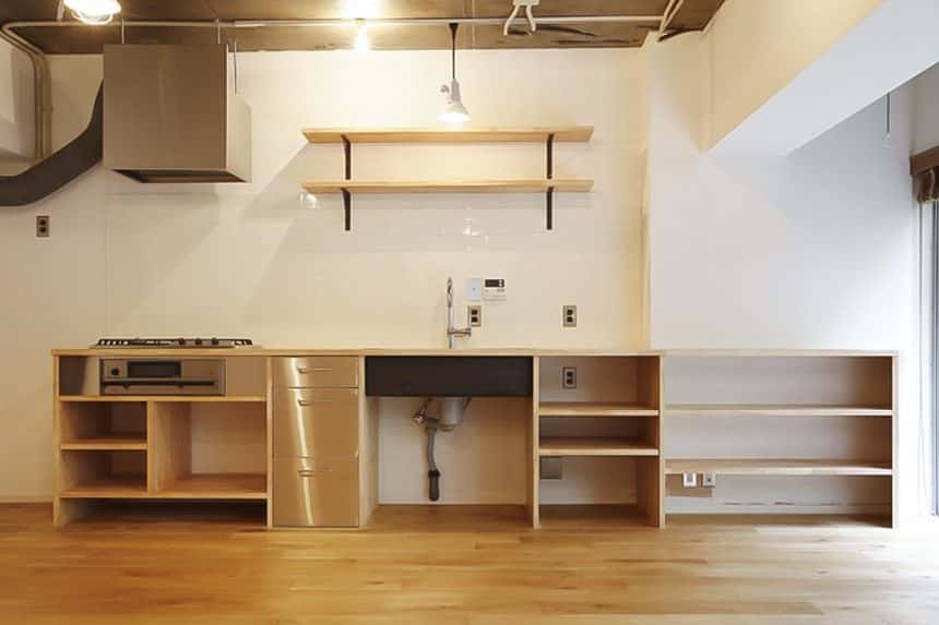 間口3000(3m)のキッチンは、集成材で造作し、ekurea(エクレア)のオーダーキッチンとハーマンのコンロを使用しています。正面は、サブウェイタイルでシンプルに。