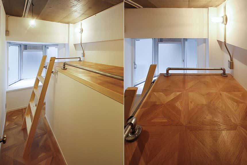 上部は、収納部屋のロフトとして室内グッズ用のスペースに。床には木片を寄せて集めたパーケットフローリングを使いました。寄木張りとも言われており、古い洋館でよく見かけますね。