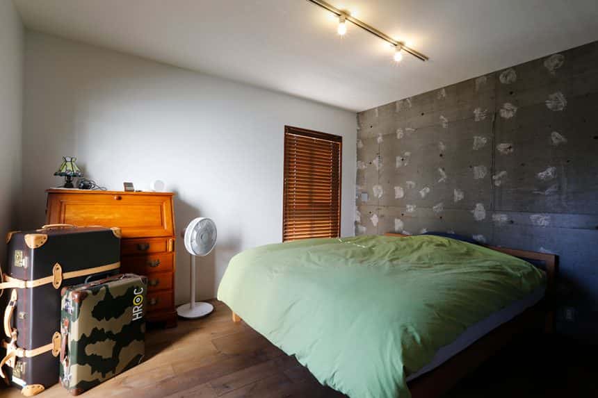 寝室の白い模様は、クロスをはがした糊の跡。これをそのまま活かすところはお施主様のセンスが光ります。