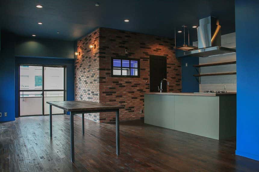リビングの青は、ご夫婦とお友だちで塗りあげました。