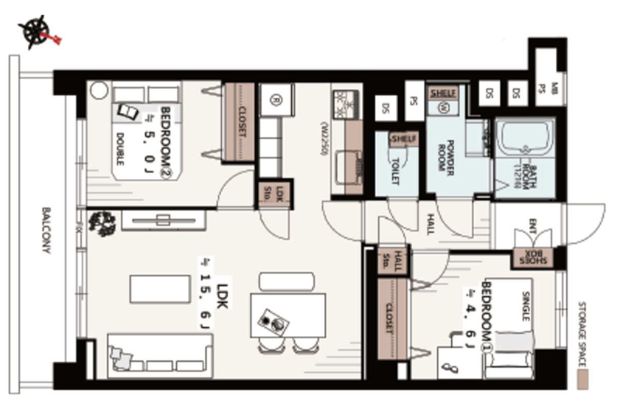 室内のリノベーションは、2025年4月に完了しています。柱が少なく家具の配置がしやすい設計のため、広々とした印象のお部屋です。グレージュカラーで統一されたカラーリングも好印象です。